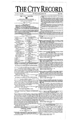 The City Record newspaper publishes notices which includes but is not limited to: public hearings and meetings, public auctions and sales, solicitations and awards and official rules proposed and adopted by city agencies. This is the City Record Newspaper for March 09, 1918.