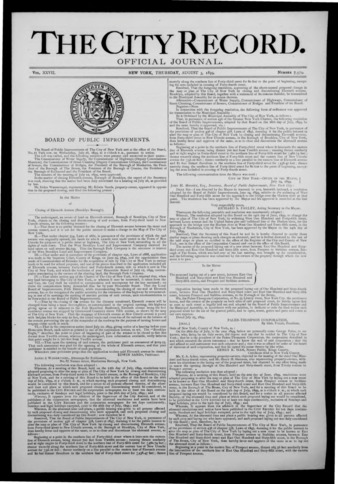 The City Record newspaper publishes notices which includes but is not limited to: public hearings and meetings, public auctions and sales, solicitations and awards and official rules proposed and adopted by city agencies. This is the City Record Newspaper for August 03, 1899.