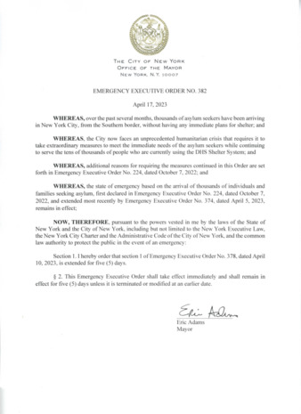 Emergency Executive Order No. 382, is being submitted to extend Emergency Executive Order No. 378, dated April 10, 2023, for five (5) days, if this relates to the state of emergency based on the arrival of thousands of individuals and families seeking asylum.