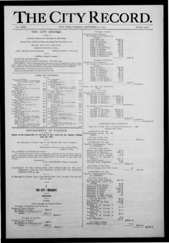 The City Record newspaper publishes notices which includes but is not limited to: public hearings and meetings, public auctions and sales, solicitations and awards and official rules proposed and adopted by city agencies. This is the City Record Newspaper for September 27, 1904.