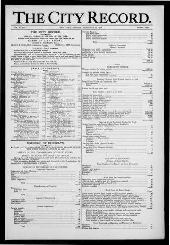 The City Record newspaper publishes notices which includes but is not limited to: public hearings and meetings, public auctions and sales, solicitations and awards and official rules proposed and adopted by city agencies. This is the City Record Newspaper for February 10, 1908.