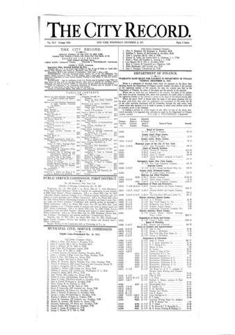 The City Record newspaper publishes notices which includes but is not limited to: public hearings and meetings, public auctions and sales, solicitations and awards and official rules proposed and adopted by city agencies. This is the City Record Newspaper for December 12, 1917.