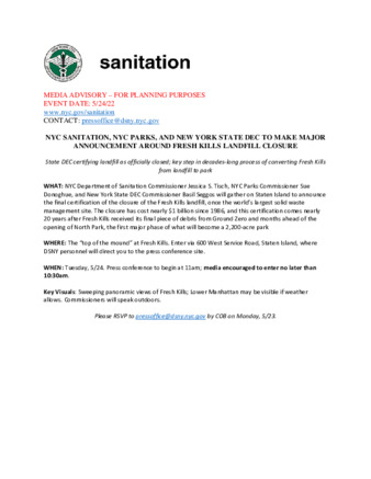 - NYC SANITATION, NYC PARKS, AND NEW YORK STATE DEC TO MAKE MAJOR ANNOUNCEMENT AROUND FRESH KILLS LANDFILL CLOSURE