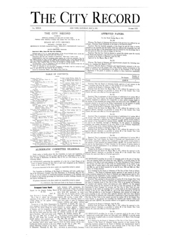 The City Record newspaper publishes notices which includes but is not limited to: public hearings and meetings, public auctions and sales, solicitations and awards and official rules proposed and adopted by city agencies. This is the City Record Newspaper for May 06, 1911.