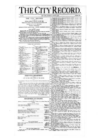 The City Record newspaper publishes notices which includes but is not limited to: public hearings and meetings, public auctions and sales, solicitations and awards and official rules proposed and adopted by city agencies. This is the City Record Newspaper for August 04, 1912.