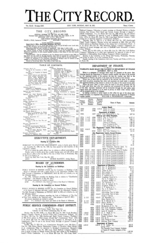 The City Record newspaper publishes notices which includes but is not limited to: public hearings and meetings, public auctions and sales, solicitations and awards and official rules proposed and adopted by city agencies. This is the City Record Newspaper for May 10, 1915.
