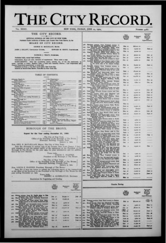 The City Record newspaper publishes notices which includes but is not limited to: public hearings and meetings, public auctions and sales, solicitations and awards and official rules proposed and adopted by city agencies. This is the City Record Newspaper for June 24, 1904.