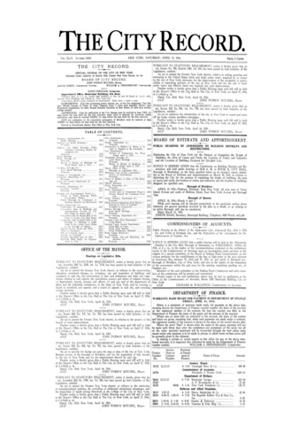 The City Record newspaper publishes notices which includes but is not limited to: public hearings and meetings, public auctions and sales, solicitations and awards and official rules proposed and adopted by city agencies. This is the City Record Newspaper for April 15, 1916.
