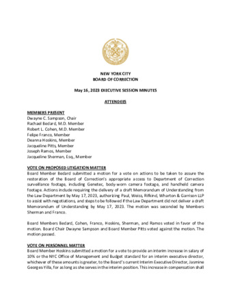 NEW YORK CITY BOARD OF CORRECTION May 16, 2023 EXECUTIVE SESSION MINUTES ATTENDEES MEMBERS PRESENT Dwayne C. Sampson, Chair Rachael Bedard, M.D. Member Robert L. Cohen, M.D. Member Felipe Franco, Member Deanna Hoskins, Member Jacqueline Pitts, Member Joseph Ramos, Member Jacqueline Sherman, Esq., Me