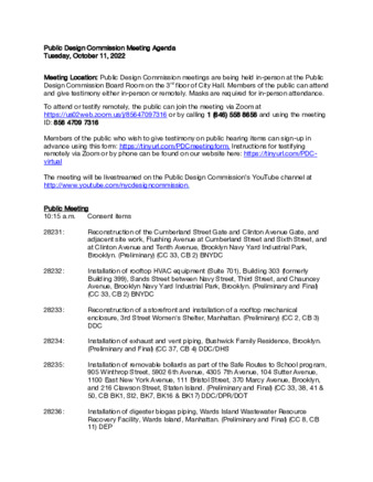The Public Design Commission meets once a month. The meeting agendas are posted online three business days in advance of each meeting and published in the City Record. Agendas are also distributed to all City Council members, Community Boards, and City agency liaisons.