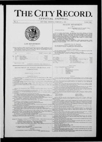 The City Record newspaper publishes notices which includes but is not limited to: public hearings and meetings, public auctions and sales, solicitations and awards and official rules proposed and adopted by city agencies. This is the City Record Newspaper for February 01, 1882.