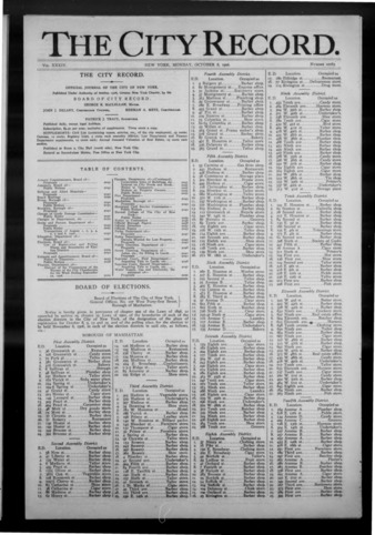 The City Record newspaper publishes notices which includes but is not limited to: public hearings and meetings, public auctions and sales, solicitations and awards and official rules proposed and adopted by city agencies. This is the City Record Newspaper for October 08, 1906.