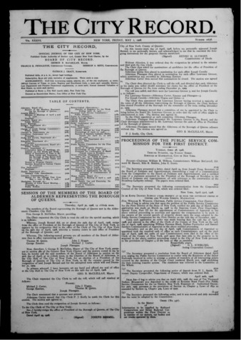 The City Record newspaper publishes notices which includes but is not limited to: public hearings and meetings, public auctions and sales, solicitations and awards and official rules proposed and adopted by city agencies. This is the City Record Newspaper for May 01, 1908.
