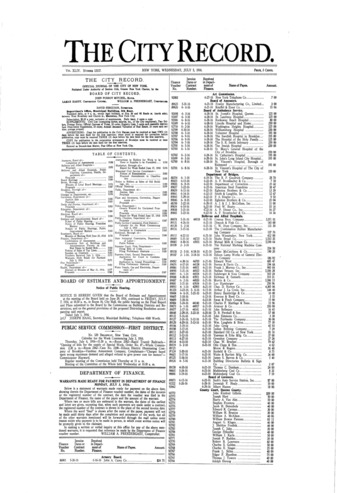 The City Record newspaper publishes notices which includes but is not limited to: public hearings and meetings, public auctions and sales, solicitations and awards and official rules proposed and adopted by city agencies. This is the City Record Newspaper for July 05, 1916.
