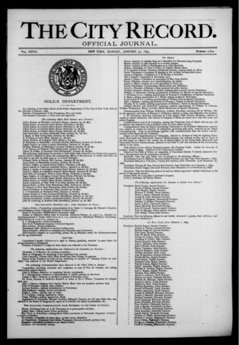 The City Record newspaper publishes notices which includes but is not limited to: public hearings and meetings, public auctions and sales, solicitations and awards and official rules proposed and adopted by city agencies. This is the City Record Newspaper for January 30, 1899.