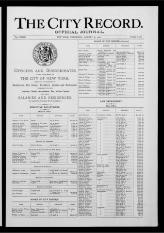 The City Record newspaper publishes notices which includes but is not limited to: public hearings and meetings, public auctions and sales, solicitations and awards and official rules proposed and adopted by city agencies. This is the City Record Newspaper for January 31, 1900.