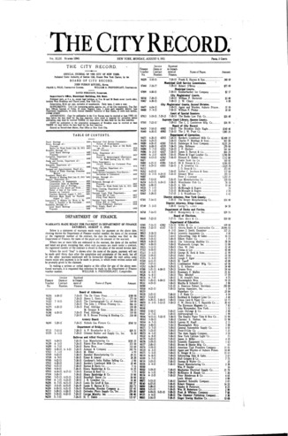 The City Record newspaper publishes notices which includes but is not limited to: public hearings and meetings, public auctions and sales, solicitations and awards and official rules proposed and adopted by city agencies. This is the City Record Newspaper for August 08, 1915 with supplement.