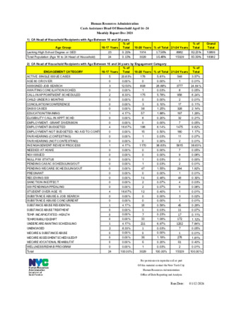 Reports engagement status of heads of household between & including the ages of 16-24. Information disaggregated by the following categories: 1) individuals aged 16 and 17; 2) individuals aged 18-20; and 3) individuals aged 21-24, calculated both as an actual number & percentage of caseload.