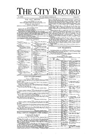 The City Record newspaper publishes notices which includes but is not limited to: public hearings and meetings, public auctions and sales, solicitations and awards and official rules proposed and adopted by city agencies. This is the City Record Newspaper for March 27, 1911.