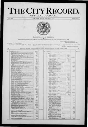 The City Record newspaper publishes notices which includes but is not limited to: public hearings and meetings, public auctions and sales, solicitations and awards and official rules proposed and adopted by city agencies. This is the City Record Newspaper for January 10, 1902.