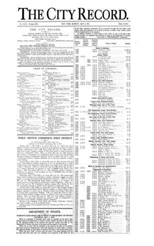 The City Record newspaper publishes notices which includes but is not limited to: public hearings and meetings, public auctions and sales, solicitations and awards and official rules proposed and adopted by city agencies. This is the City Record Newspaper for May 03, 1915.