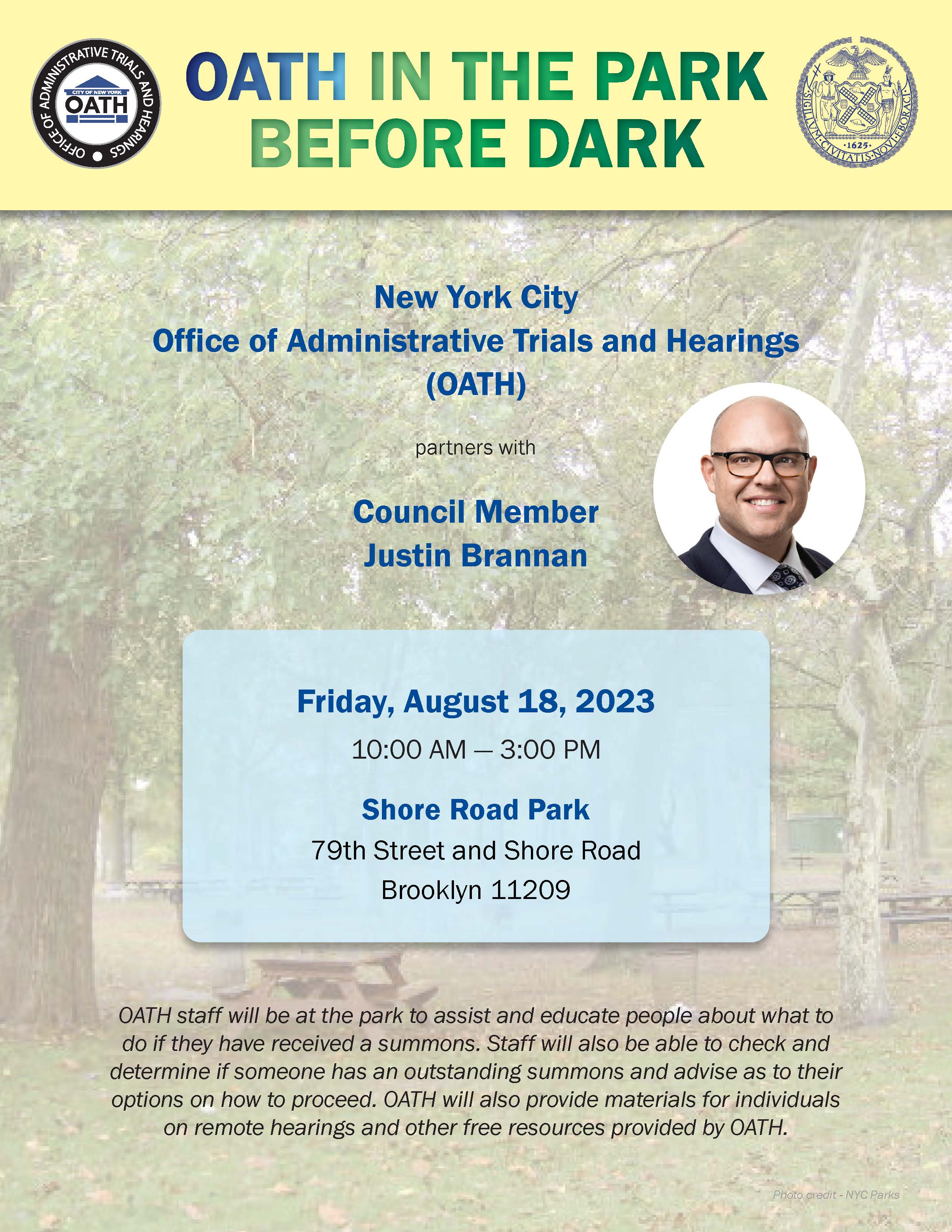OATH staff were at the park to assist and educate individuals about what to do should they have received a summons and to check to determine if someone has an outstanding summons. Materials about remote hearings and other free resources were provided to the public as well.