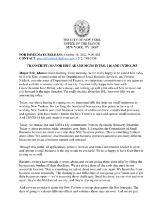 A transcript about New York City Mayor Eric Adams signs Intro. 116 and Intro. 383 regarding small businesses, permits, and licenses.