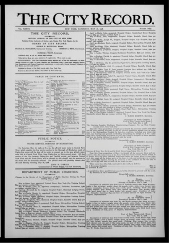 The City Record newspaper publishes notices which includes but is not limited to: public hearings and meetings, public auctions and sales, solicitations and awards and official rules proposed and adopted by city agencies. This is the City Record Newspaper for May 16, 1908.