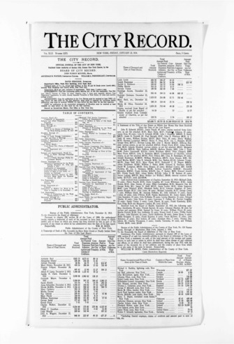 The City Record newspaper publishes notices which includes but is not limited to: public hearings and meetings, public auctions and sales, solicitations and awards and official rules proposed and adopted by city agencies. This is the City Record Newspaper for January 23, 1914.