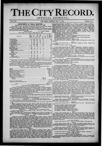 The City Record newspaper publishes notices which includes but is not limited to: public hearings and meetings, public auctions and sales, solicitations and awards and official rules proposed and adopted by city agencies. This is the City Record Newspaper for May 11, 1897.