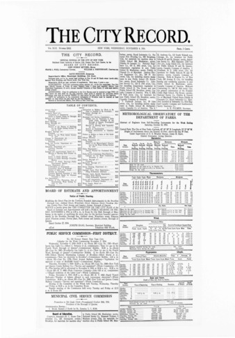 The City Record newspaper publishes notices which includes but is not limited to: public hearings and meetings, public auctions and sales, solicitations and awards and official rules proposed and adopted by city agencies. This is the City Record Newspaper for November 04, 1914.