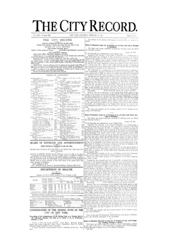 The City Record newspaper publishes notices which includes but is not limited to: public hearings and meetings, public auctions and sales, solicitations and awards and official rules proposed and adopted by city agencies. This is the City Record Newspaper for February 13, 1915.
