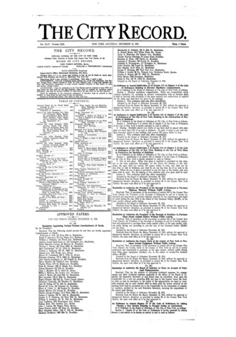 The City Record newspaper publishes notices which includes but is not limited to: public hearings and meetings, public auctions and sales, solicitations and awards and official rules proposed and adopted by city agencies. This is the City Record Newspaper for December 16, 1916.