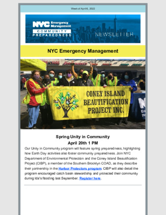 The NYCEM Community Preparedness newsletter provides information about preparedness initiatives, resources and local events to community and faith-based organizations, leaders and the general public of New York City. During emergencies, important alerts and updates are issued to all who subscribe.