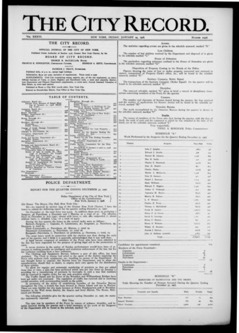 The City Record newspaper publishes notices which includes but is not limited to: public hearings and meetings, public auctions and sales, solicitations and awards and official rules proposed and adopted by city agencies. This is the City Record Newspaper for January 24, 1908.