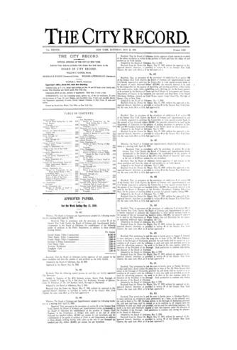 The City Record newspaper publishes notices which includes but is not limited to: public hearings and meetings, public auctions and sales, solicitations and awards and official rules proposed and adopted by city agencies. This is the City Record Newspaper for May 21, 1910.