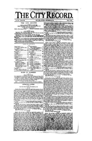 The City Record newspaper publishes notices which includes but is not limited to: public hearings and meetings, public auctions and sales, solicitations and awards and official rules proposed and adopted by city agencies. This is the City Record Newspaper for September 26, 1914.