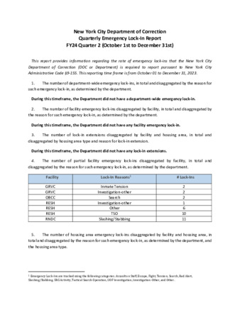 Pursuant to Local Law 164 of 2018, this report provides information pertaining to emergency lock-ins in the city's jails that occurred during the preceding quarter.