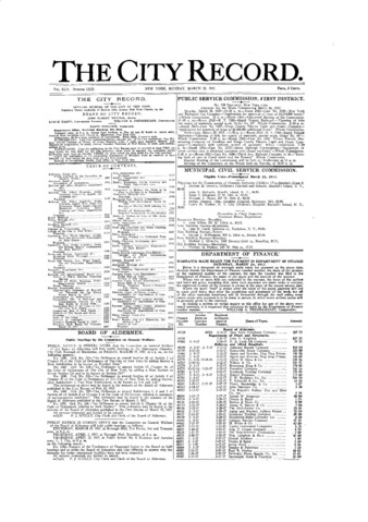 The City Record newspaper publishes notices which includes but is not limited to: public hearings and meetings, public auctions and sales, solicitations and awards and official rules proposed and adopted by city agencies. This is the City Record Newspaper for March 26, 1917.