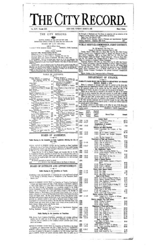 The City Record newspaper publishes notices which includes but is not limited to: public hearings and meetings, public auctions and sales, solicitations and awards and official rules proposed and adopted by city agencies. This is the City Record Newspaper for March 05, 1918.