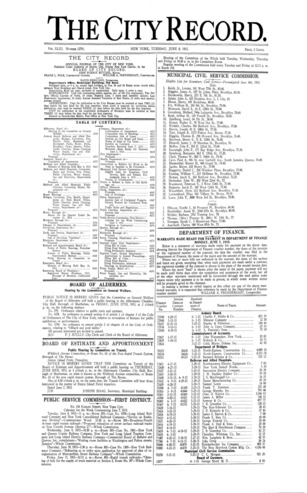 The City Record newspaper publishes notices which includes but is not limited to: public hearings and meetings, public auctions and sales, solicitations and awards and official rules proposed and adopted by city agencies. This is the City Record Newspaper for June 08, 1915.