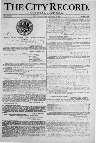 The City Record newspaper publishes notices which includes but is not limited to: public hearings and meetings, public auctions and sales, solicitations and awards and official rules proposed and adopted by city agencies. This is the City Record Newspaper for December 03, 1900.