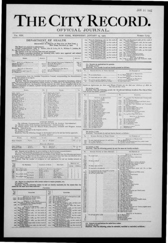 The City Record newspaper publishes notices which includes but is not limited to: public hearings and meetings, public auctions and sales, solicitations and awards and official rules proposed and adopted by city agencies. This is the City Record Newspaper for January 15, 1902.