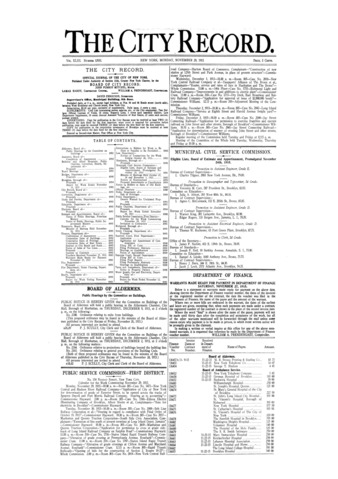 The City Record newspaper publishes notices which includes but is not limited to: public hearings and meetings, public auctions and sales, solicitations and awards and official rules proposed and adopted by city agencies. This is the City Record Newspaper for November 29, 1915.