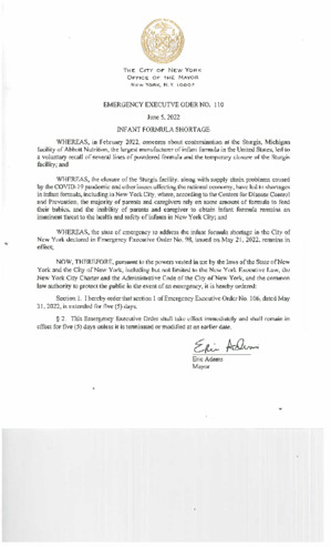 Emergency Executive Order No. 110, extends Emergency Executive Order No. 106, dated May 31, 2022, for five (5) days, if this is related to Infant Formula Shortage.