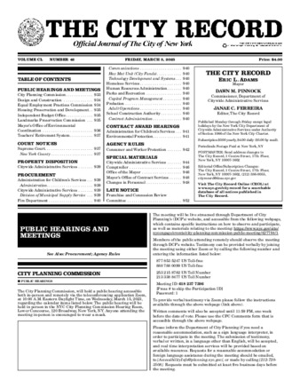 The City Record newspaper publishes notices which includes but is not limited to public hearings and meetings, public auctions and sales, solicitations and awards and official rules proposed and adopted by city agencies.