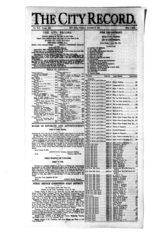 The City Record newspaper publishes notices which includes but is not limited to: public hearings and meetings, public auctions and sales, solicitations and awards and official rules proposed and adopted by city agencies. This is the City Record Newspaper for October 27, 1914.