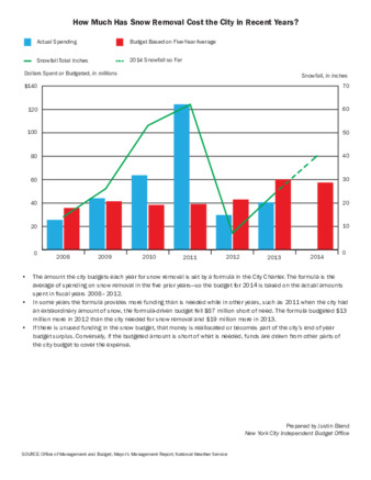 The amount the city budgets each year for snow removal is set by a formula in the City Charter. The formula is the average of spending on snow removal in the five prior years—so the budget for 2014 is based on the actual amounts spent in fiscal years 2008–2012.