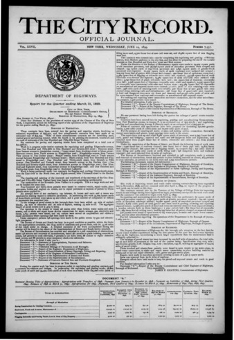 The City Record newspaper publishes notices which includes but is not limited to: public hearings and meetings, public auctions and sales, solicitations and awards and official rules proposed and adopted by city agencies. This is the City Record Newspaper for June 14, 1899.