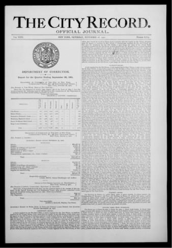 The City Record newspaper publishes notices which includes but is not limited to: public hearings and meetings, public auctions and sales, solicitations and awards and official rules proposed and adopted by city agencies. This is the City Record Newspaper for November 16, 1901.